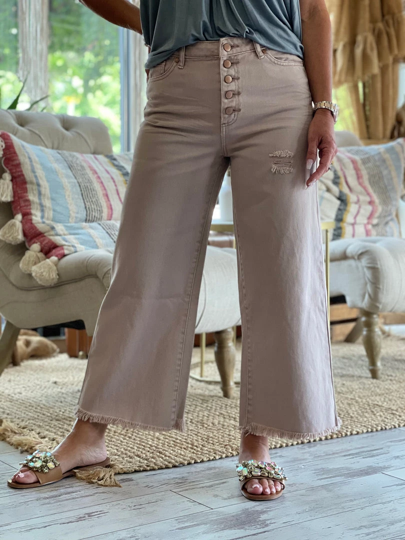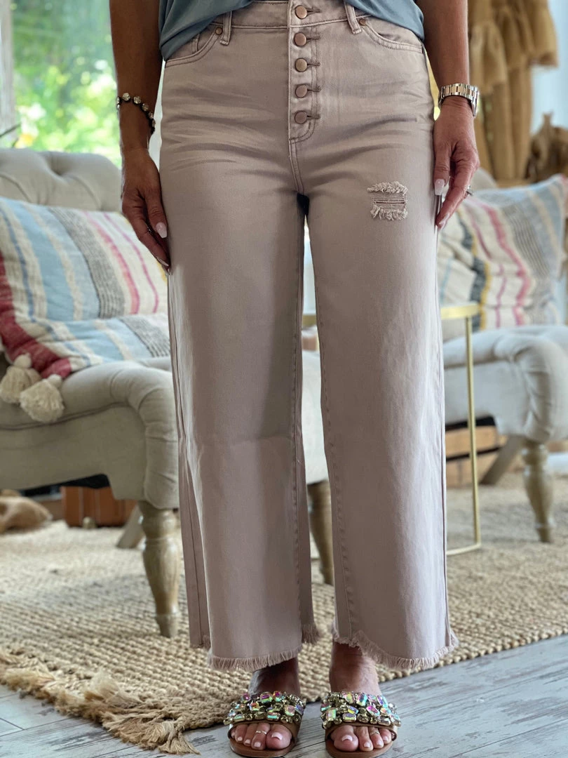 Easel Button Fly Wide Leg Pants With Raw Hem In Light Mauve BOTTOMS