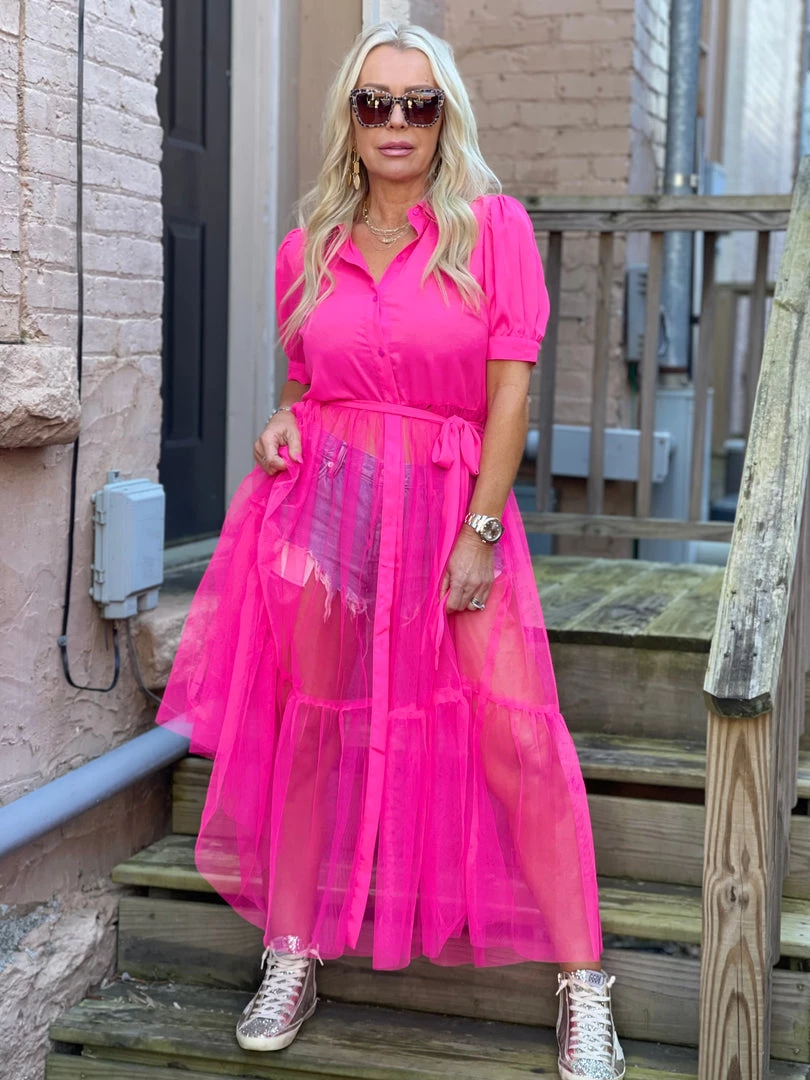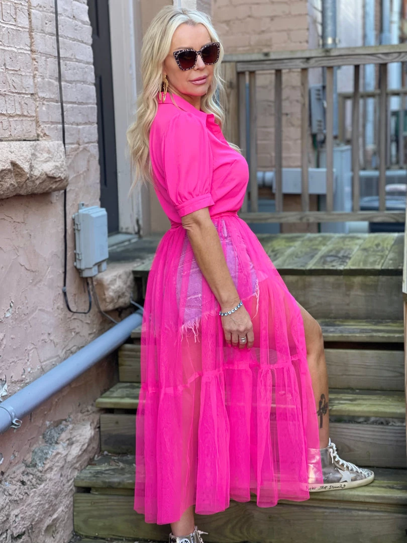 Flying Tomato Tulle Shirt Dress Cover Up In Hot Pink TOPS