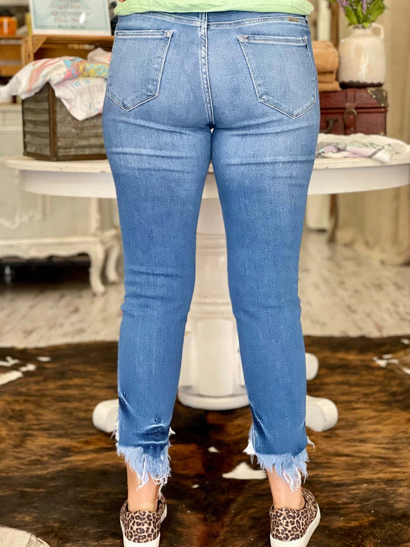 Kancan Mid Rise Distressed Asymmetric Hem Skinny Jeans BOTTOMS